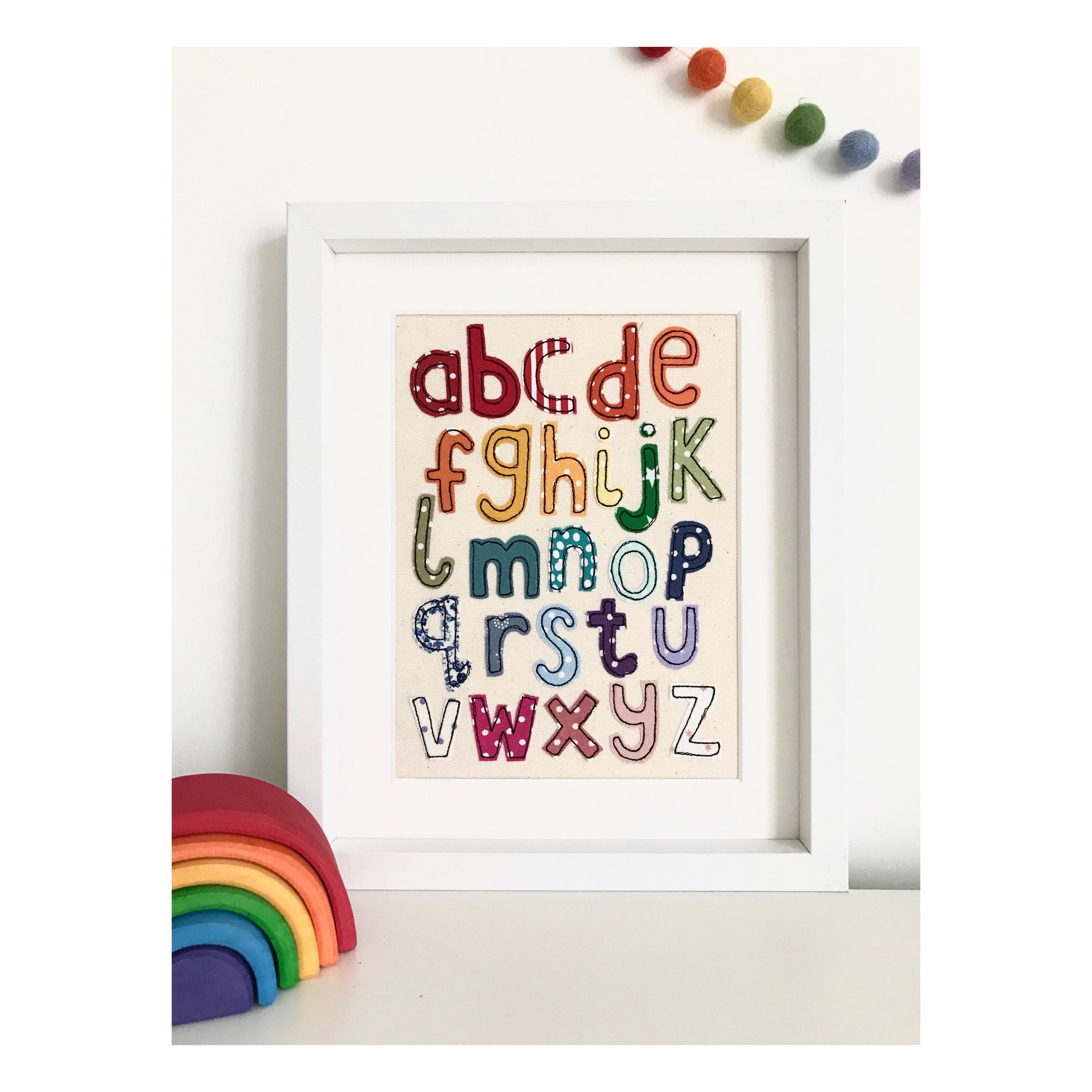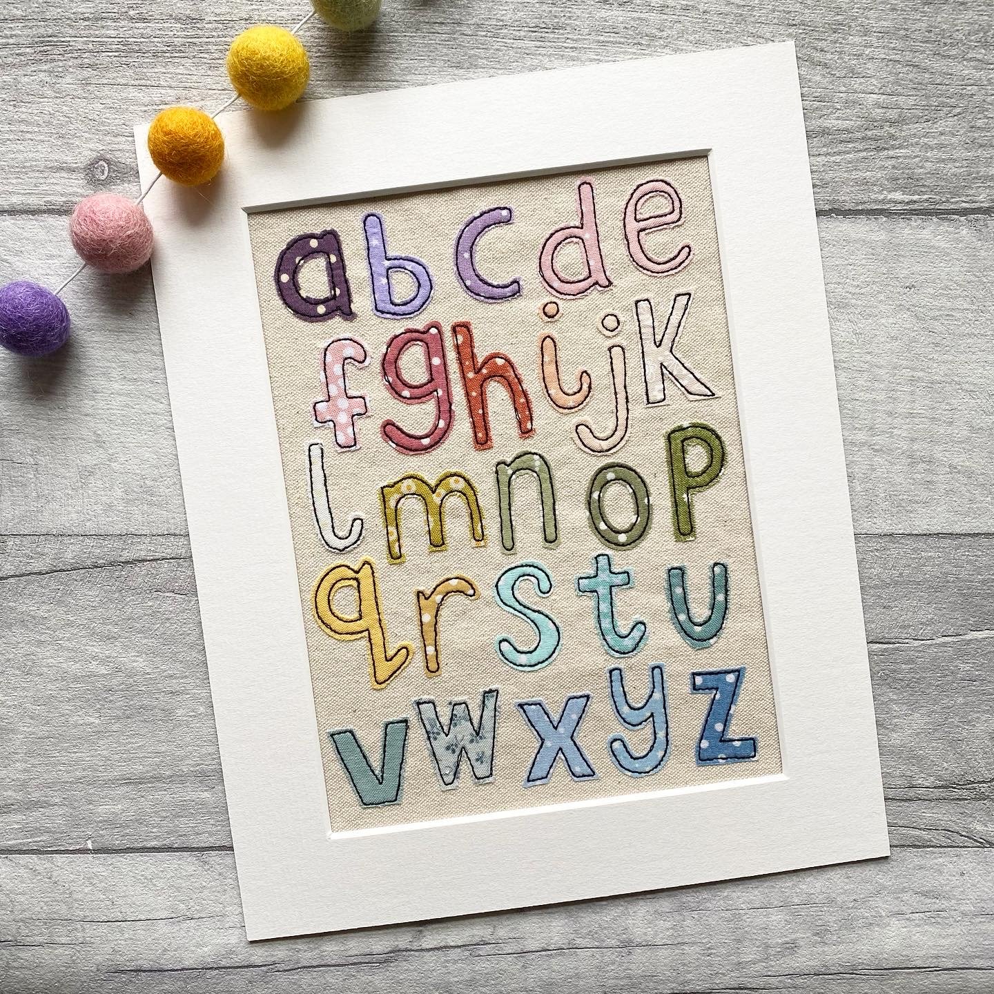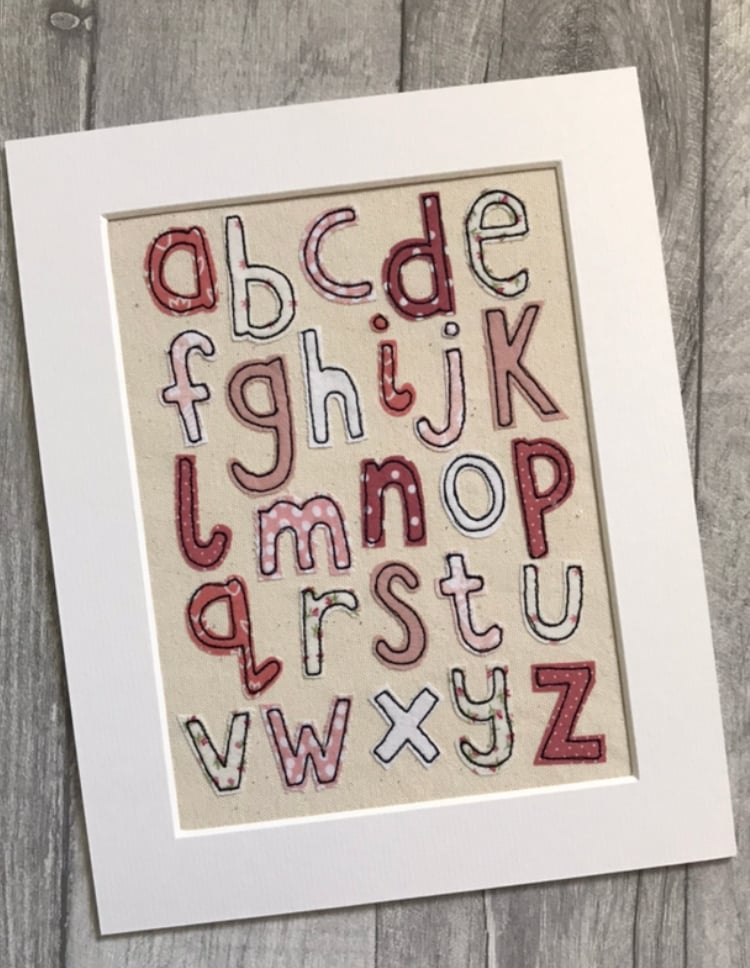 A hand cut textile alphabet picture made from a lovely selection of fabrics. machine stitched onto a canvas background.