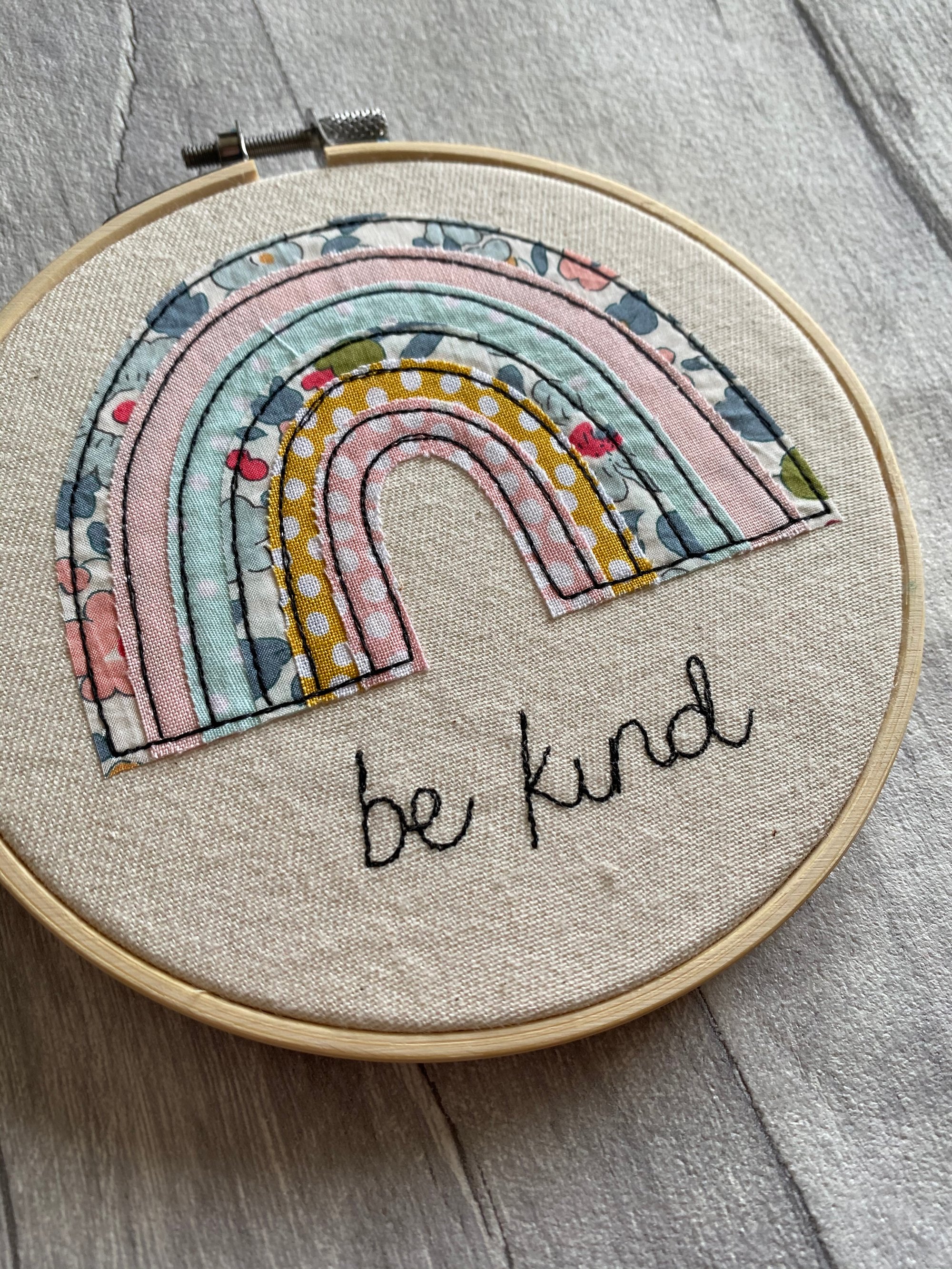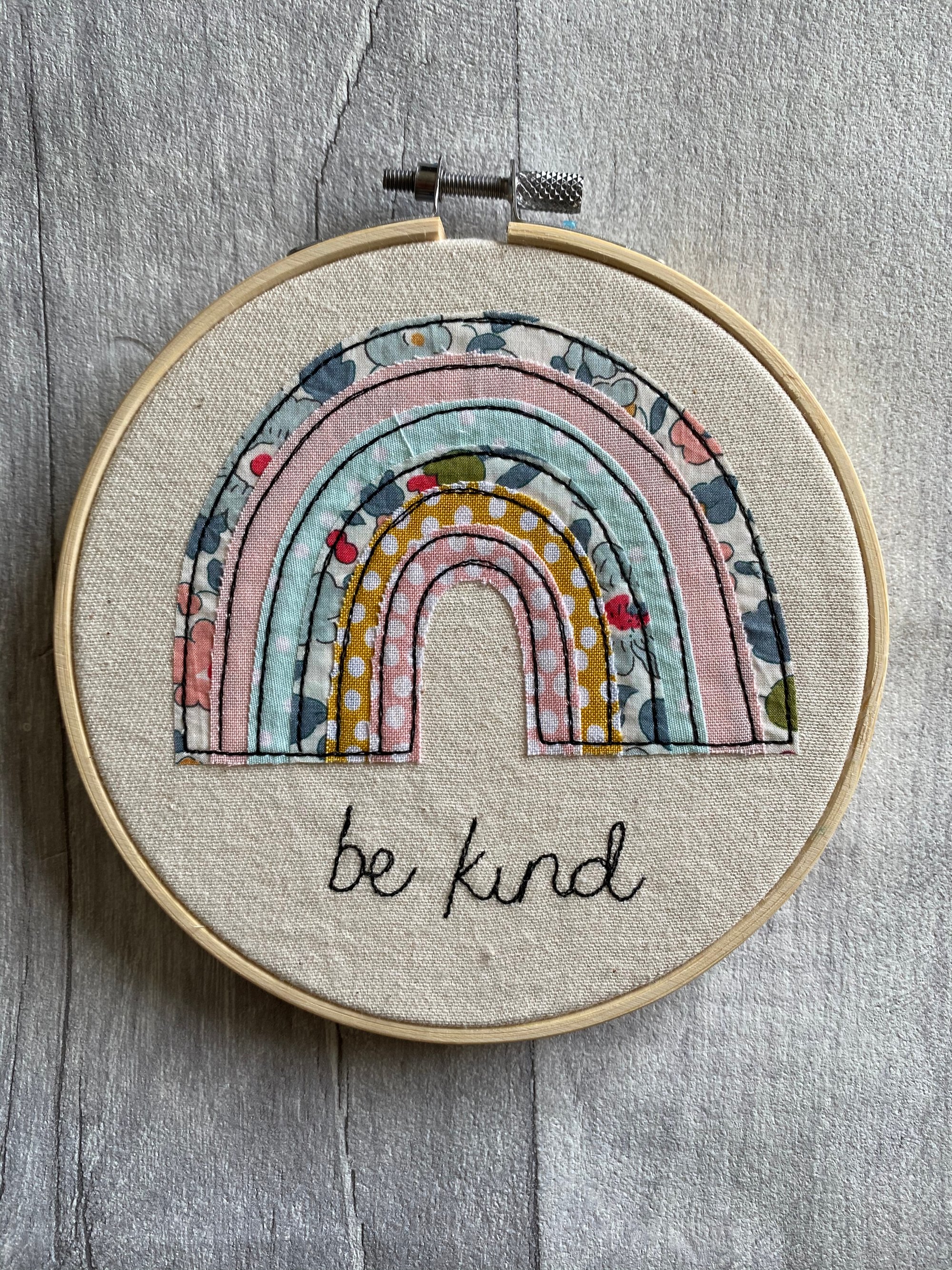 A 5in hoop featuring a handcut, machine stitched rainbow. The rainbow is made up of plain, patterned and liberty print fabrics