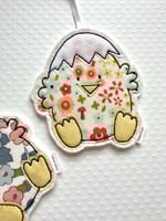 Each decoration is individually handmade. It is cut from a quality fabric and free motion machine stitched onto a felt background.