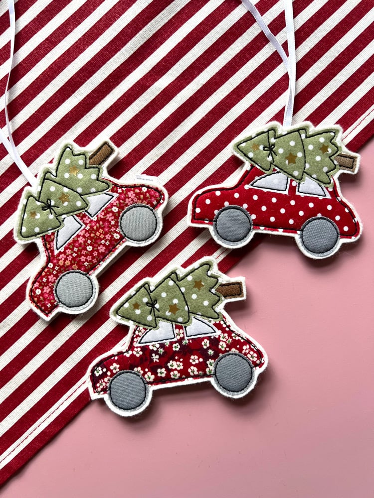 Each decoration is individually handmade. It is cut from a quality fabric and free motion machine stitched onto a wool blend felt background.