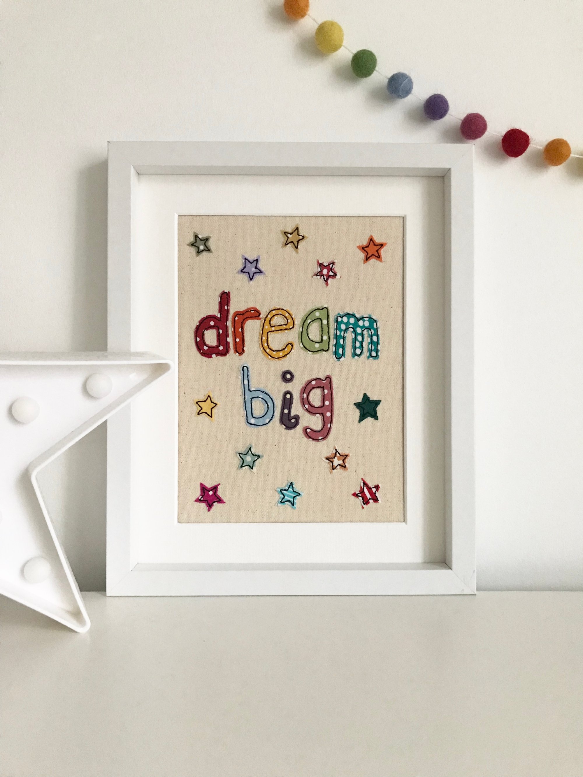 A hand cut textile picture made from fabric letters machine stitched onto a canvas background.