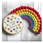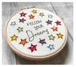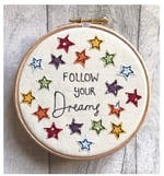 A hoop featuring a handcut, free motion machine stitched stars and quote