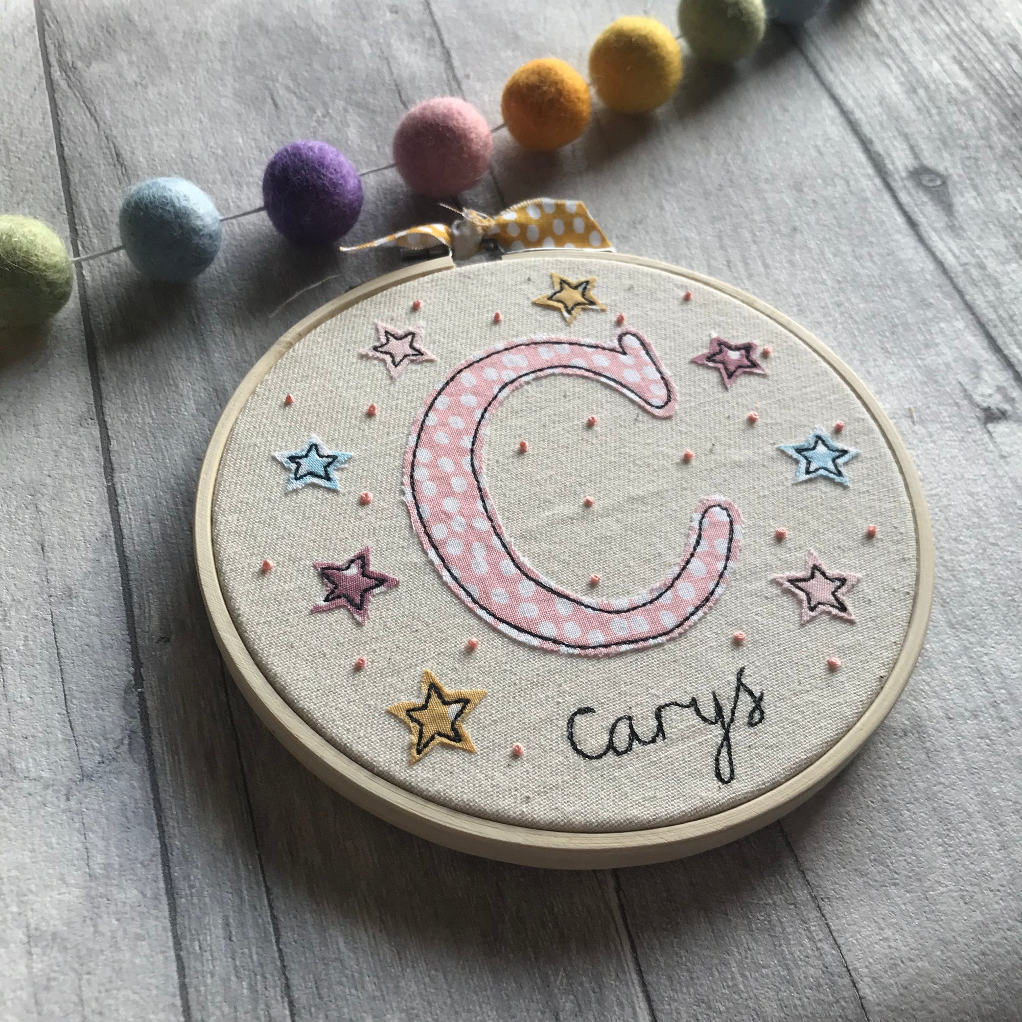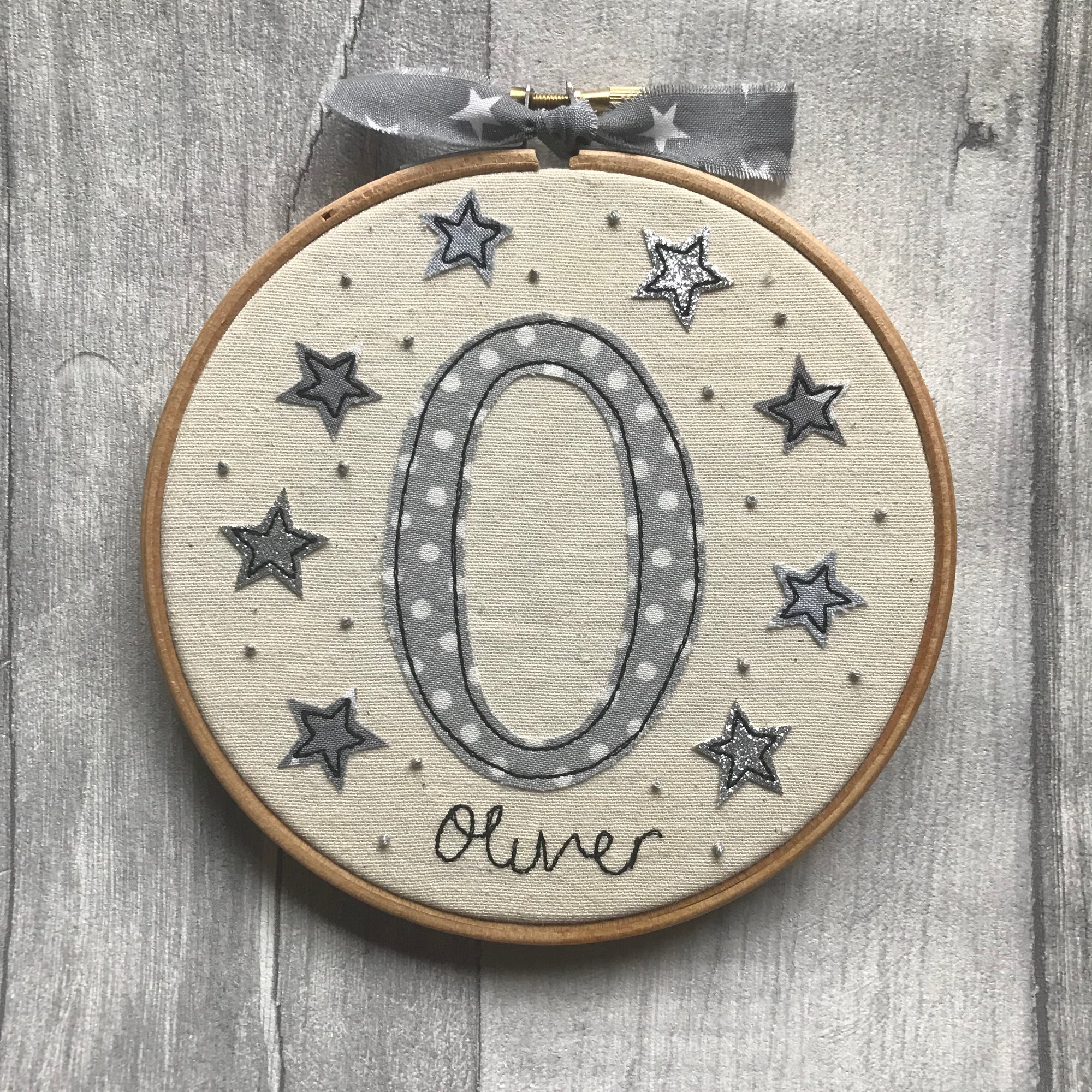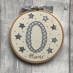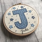 A hoop featuring a handcut, machine stitched initial with added star and French knot detail.