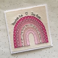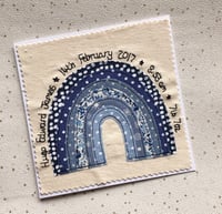 A beautiful rainbow card with name and birth details around the edge